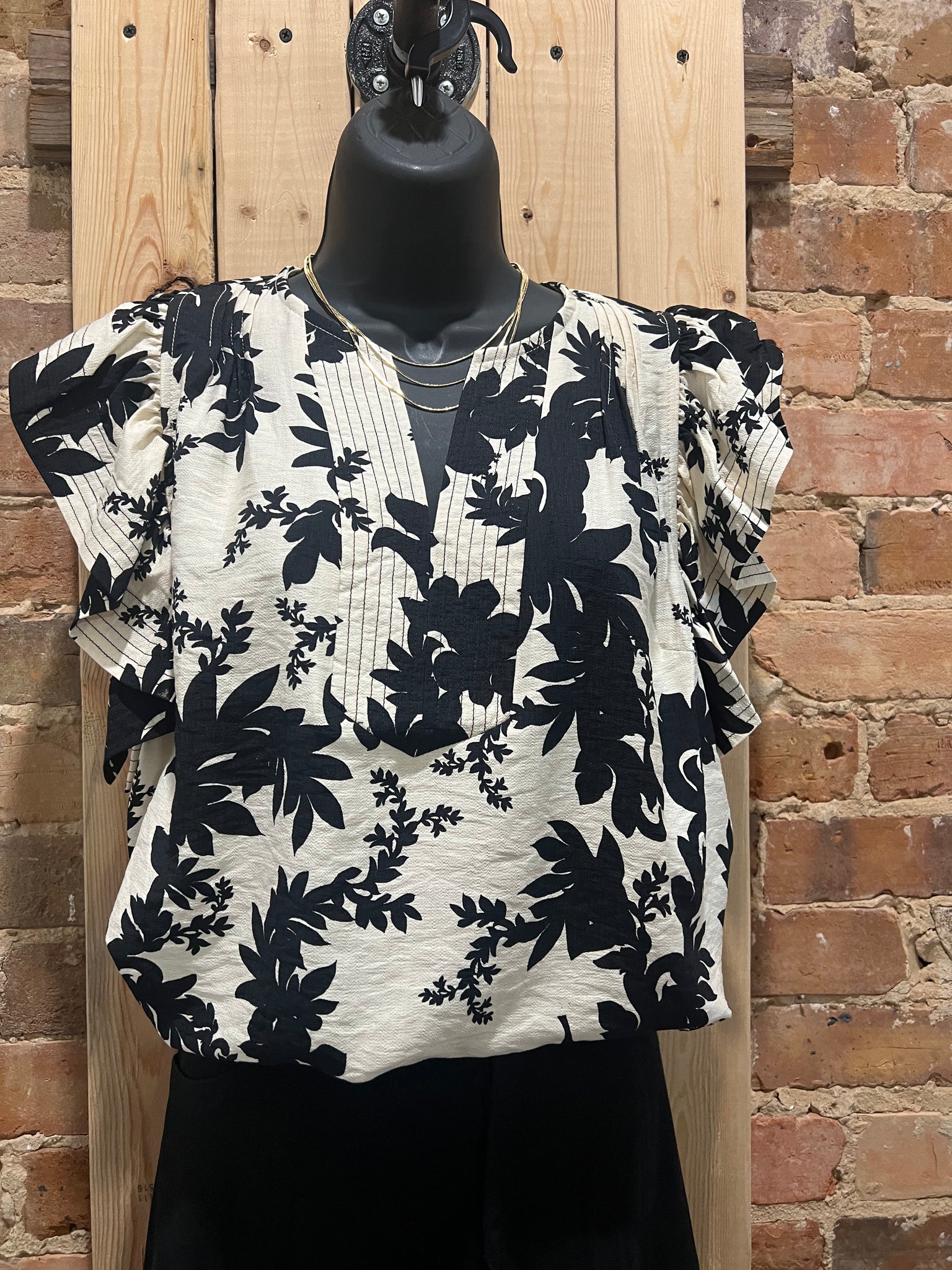 Turn heads in this chic black-and-ivory floral top featuring a bold botanical print that pops beautifully against the soft cream background. The pin-tucked neckline adds a touch of sophistication, while the fluttery ruffle sleeves give it that perfect feminine flair you will love. Lightweight, easy to style, and dress-it-up or dress-it-down friendly—this top is a must-have for work, brunch, and everything in between.