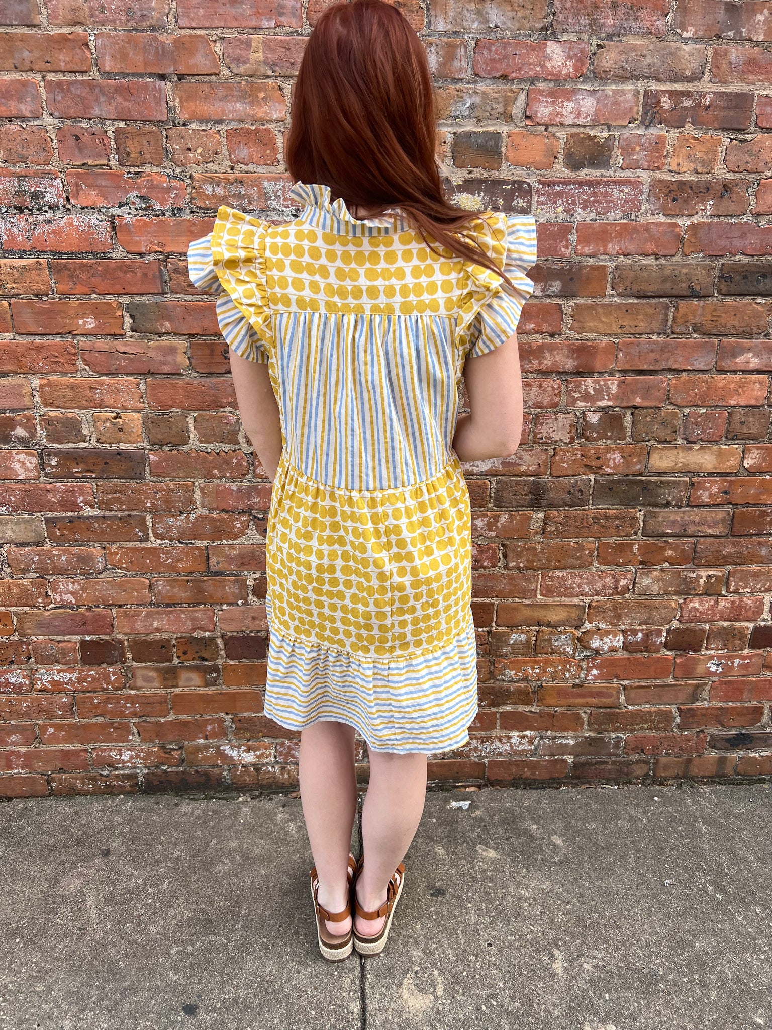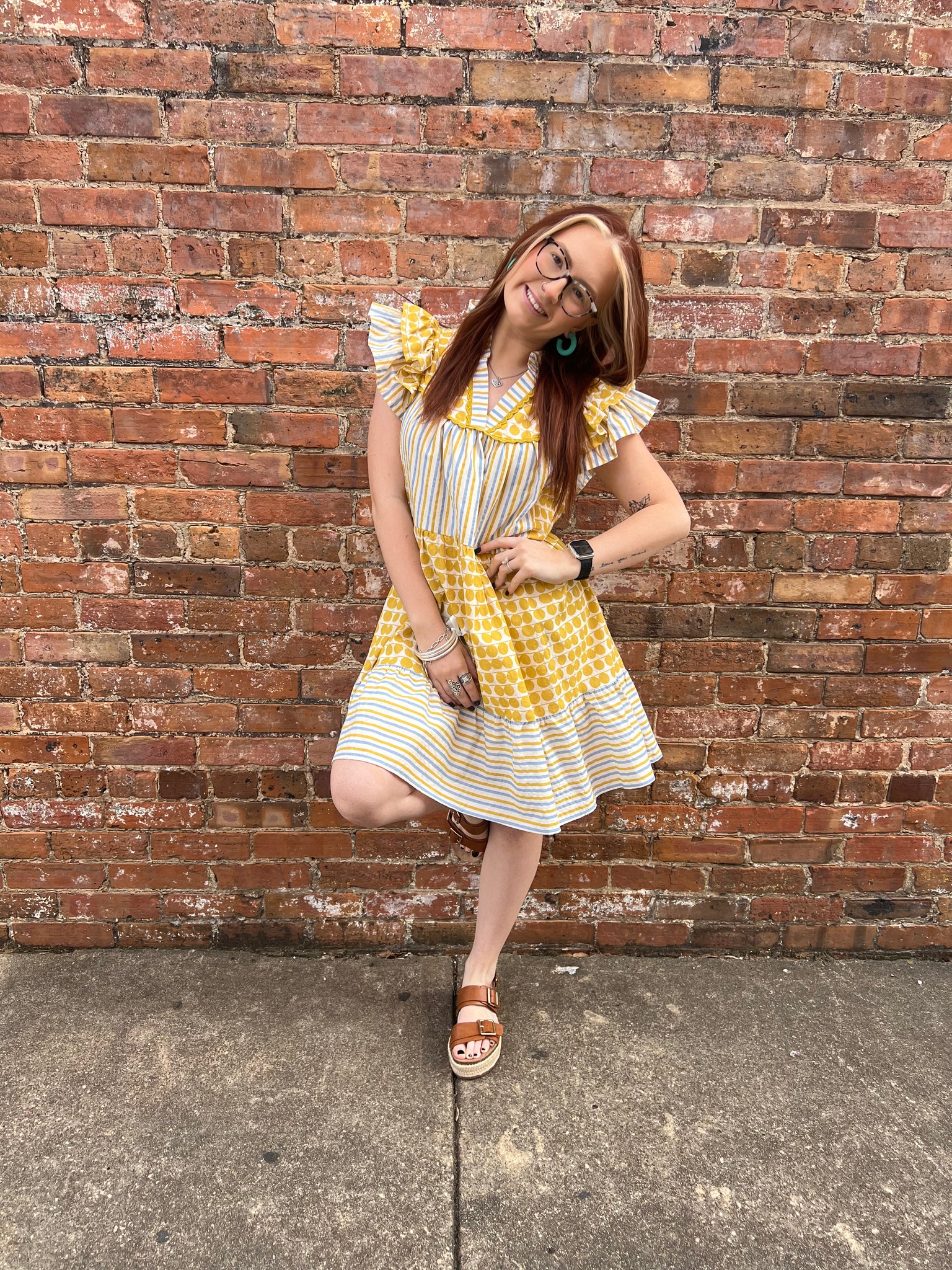 Bright, cheerful, and full of personality, the Sunny Day Patchwork Umgee Dress is the perfect throw-on-and-go piece for warm-weather days. This tiered mini features a playful mix of yellow dot prints and soft striped panels that create a fun, patchwork-inspired look.